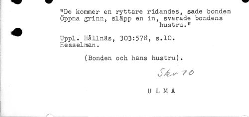 //// ; //// "De kommer en ryttare ridandes, sade bonden //// Öppna grinn, släpp en in, svarade bondens //// hustru." //// Uppl. Hållnäs, 303:578, s.10. //// Hesselman. //// i //// (Bonden och hans hustru). //// U L M A ////