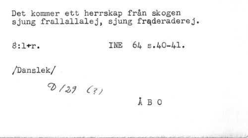 //// Det kommer ett herrskap från skogen //// sjung frallallalej, sjung frqderaderej. //// 3:l+r. INE 64 s.40-41. //// /Danslek //// /ÅBO ////