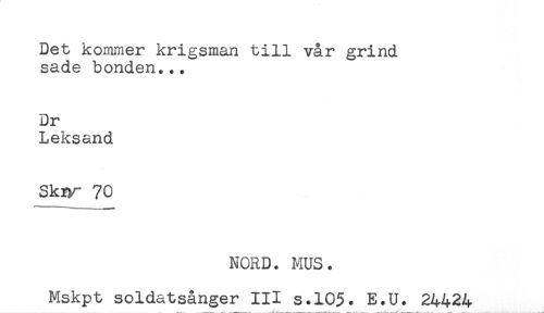//// Det kommer krigsman till vår grind //// sade bonden... //// Dr //// Leksand //// Skiy- 70 //// ...... -HH*** //// NORD. MUS. //// Mskpt soldatsånger III s.105. E.U. 24424 ////