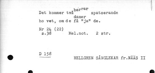 //// .herrar I //// Det kommer tva spatserande //// damer //// ho vet, om de få "ja" de. //// Nr 24 (22) //// s.33 Mel.not. 2 str. //// D 158 //// # --HELLGREN SÅNGLEKAR fr.NÄÄS II //// HR*;,. . ////