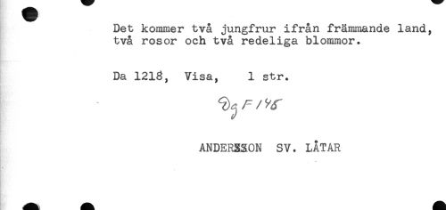 //// Det kommer två jungfrur ifrån främmande land, //// två rosor och två redeliga blommor. //// Da 1218, Visa, 1 str. //// ANDERSSON SV. LÅTAR //// .. - //// * //// - ////