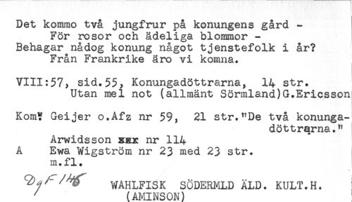 //// Det kommo två jungfrur på konungens gård - //// För rosor och ädeliga blommor - //// Behagar nådog konung något tjenstefolk i år? //// Från Frankrike äro vi komna. //// i //// ! //// VIII:57; sid.55; Konungadöttrarna, 14 str. //// Utan mel not (allmänt Sörmland) G.Ericsson! //// Kom? Geijer o.Afz nr 59, 21 str."De två konunga- //// döttrarna." //// Arwidsson g&x nr 114 //// A Ewa Wigström nr 23 med 23 str. i //// m.fl. //// WAHLFISK SÖDERMLDÄLD. KULT.H. //// ' (AMINSON) ////