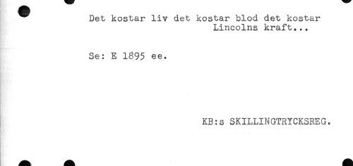 //// Det kostar liv det kostar blod det kostar //// Lincolns kraft... //// Se: E 1895 ee. //// : //// KB:s SKILLINGTRYCKSREG. ////