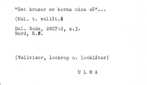 //// "Det krusar av korna mina så"... //// (Mel. t. vallat.% //// Dal. Noda, 2807:2, s.3. //// Nord, E.H. //// (Vallvisor, lockrop o. locklåtar) //// * \ //// U L M A ////