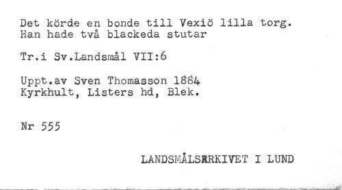 //// Det körde en bonde till Vexiö lilla torg. //// Han hade två blackeda stutar //// Tr.i Sv.Landsmål VII:6 //// Uppt.av Sven Thomasson 1884 //// Kyrkhult, Listers hd, Blek. //// Nr 555 //// LANDSMÅLSRRKIVET I LUND ////