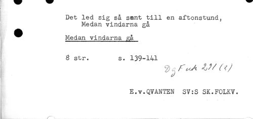 //// Det led sig så sent till en aftonstund, //// Medan vindarna gå //// ^ ^ Medan vindarna gå //// 8 str. s. 139-141 //// I ^ //// : //// E.v.QVÅNTEN SV:S SK.FOLKV. //// . - ////