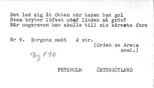 //// Det led sig åt Ottan när hanen han gol //// Hvem bryter löfvet utaf linden så grön? //// När ungersven han skulle till sin kärewta fara //// Nr Sorgens makt 2 str. //// (Orden se Arw:s //// saml.) //// f ^ //// FRYKHOLM ÖSTERGÖTLAND //// " ////