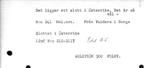 //// Det ligger ett slott i Österrike, Det är så //// väl - //// t //// N:o 241 Mel.not. Från Valders i Norge //// Slottet i Österrike //// (Jmf N:o 210-2111 L ^ //// ^ AHLSTRöM 300 FOLKV. //// ' K * ////
