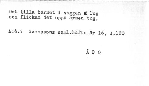 //// Det lilla barnet i vaggan g log //// och flickan det uppå armen tog, //// 4:6.? Svenssons saml.häfte Nr 16, s.180 //// ÅBO ////