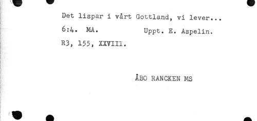 //// Det lispar i vårt Gottland, vi lever... //// 6:4. MA. Uppt. E. Aspelin. //// R3, 155, XXVIII. //// ÅBO RANCKEN MS ////