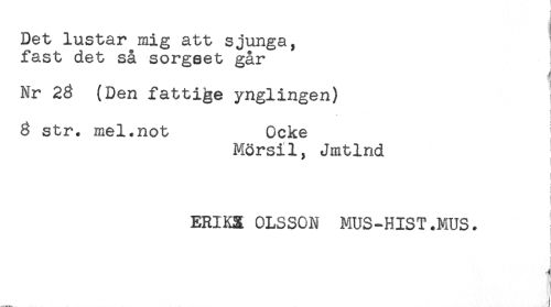 //// Det lustar mig att sjunga, ' //// fast det så sorgset går //// Nr 23 (Den fattige ynglingen) i //// 3 str. mel.not Ocke //// Mörsil, Jmtlnd //// i //// I //// ERIKX OLSSON MUS-HIST.MUS. ////