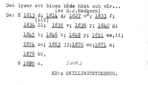 //// Det lyser ett bloss bade höst och vår... //// (Av S.J.Hedborn) //// Se: E 1313 d; 1314 g,: 1827 o^: 1833 f; //// (tt?f^ - - //// 1334 11; 1835 v; 1836 y; 18^0 g; //// 1845 t; 1846 t; 1849 p; 1851 aa,ii; //// 1854 00; 1863 1870 ee;l871 x; //// 1876 bb, //// N I8p6 c. //// KB:s SKILLINGTRYCKSREG. ////