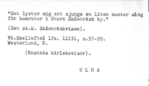 //// "Det lyster mig att sjunga en liten munter sång //// för kamrater i Stora Skåmträsk by." ' //// ) //// (Den sk.k. Skåmträskvisan). //// i //// Vb.Skellefteå lfs. 11151, s.57-59. ' //// Westerlund, E. //// (Enstaka kärleksvisor). i //// < //// i //// U L M A ' //// } ////