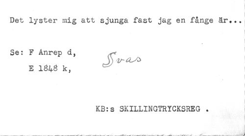 //// Det lyster mig att sjunga fast jag en fånge är*.. //// * //// Se: F Anrep d, //// J 2/- //// E k, //// i //// KB:s SKILLINGTRYCKSREG . ////