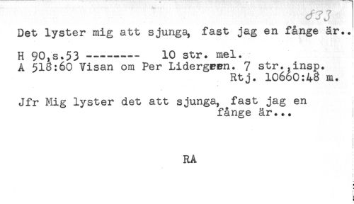 //// Det lyster mig att sjunga, fast jag en fånge är.. //// H 90,s.53--- 10 str. mel. //// A 518:60 Visan om Per Lidergcen. 7 str.,insp. //// Rtj. 10660:48 m. //// Jfr Mig lyster det att sjunga, fast jag en //// fånge är... ! //// i //// < //// t //// i //// i //// RA //// ) //// i //// < //// < //// L ////