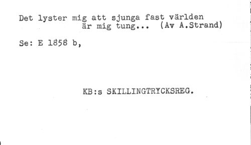 //// Det lyster mig att sjunga fast världen //// är mig tung... (Av A.Strand) //// Se: E 1858 b, //// < //// ! //// i //// KB:s SKILLINGTRYCKSREG. ; //// * ^ //// ! ////