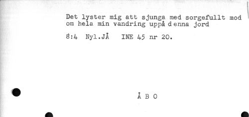 //// Det lyster mig att sjunga med sorgefullt mod //// om hela min vandring uppå denna jord //// 8:4 Nyl.JÅ INE 45 nr 20. //// f //// ^ ÅBO ////