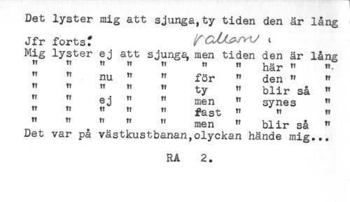 //// Det lyster mig att sjunga,ty tiden den är lång //// Jfr forts? ^t //// Mig lyster ej att sjunga men tiden den är lång //// " " " " " tt !! n ,, //// " " nu " " för " den " " //// " " " " " ty " blir så " //// ' " ej " " men " synes " //// " " " " " fast " " " //// " " " " " men " blir så " //// Det var på västkustbanan,olyckan hände mig... //// RA 2. ////