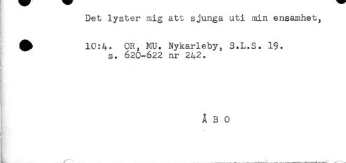 //// Det lyster mig att sjunga uti min ensamhet, //// t //// g- - //// ! //// ^ 10:4. OR, MU. Nykarleby, S.L.S. 19. //// s. 620-622 nr 242. //// ÅBO ////