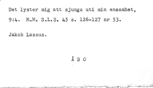 //// Det lyster mig att sjunga uti min ensamhet, //// 9:4. M.M. S.L.S. 45 s. 126-127 nr 53. //// Jakob Lassus. //// ÅBO ////