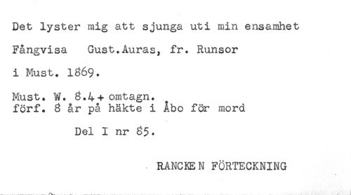 //// Det lyster mig att sjunga uti min ensamhet //// Fångvisa Gust.Auras, fr. Runsor //// i Must. 1369. //// Must. W. 8.4+ omtagn. //// förf. 8 år på häkte i Åbo för mord //// Del I nr 8$. //// RANCKEN FÖRTECKNING ////