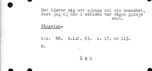 //// Det löster mig att sjunga uti min ensamhet, //// fast jag ej här i världen har någon glädje //// mött. //// FånRvisay //// 4:4* RE. S.L.S. 63. s. 1?. nr 113. //// N. ////