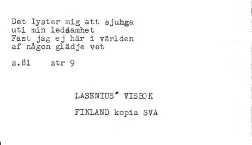 //// Det lyster mig att sjuhga //// uti min leddamhet //// Fast jag ej här i världen //// af någon glädje vet //// s.3l str 9 //// - //// i //// LASENIUS* VISBOK //// i //// FINLAND kopia SVA //// < //// < //// i ////
