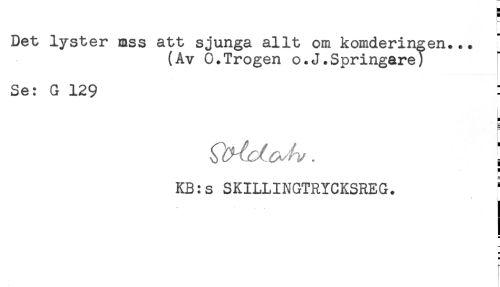 //// Det lyster mss att sjunga allt om komderingen... //// (Av 0.Trogen o.J.Springare) //// Se? G 129 i //// ! //// ! //// H //// KB:s SKILLINGTRYCKSREG. = //// * < ////