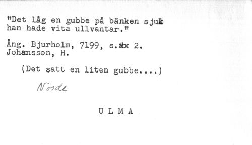 //// "Det låg en gubbe på bänken sjuk //// han hade vita ullvantar." //// Ang. Bjurholm, 7199, s.Éx 2. //// Johansson, H. //// (Det satt en liten gubbe....) //// U L M A ////