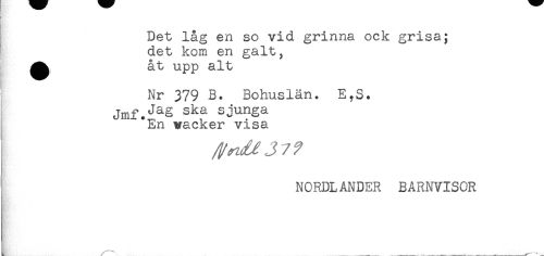 //// Hy.' //// ( //// Det låg en so vid grinna ock grisa; //// det kom en galt, //// ^ åt upp alt //// Nr 379 B. Bohuslän. E,S. //// Jmf.^as ska sjunga //// En wacker visa //// J / //// /NORDLANDER BARNVISOR ////