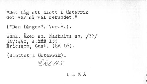 //// "Det låg ett slott i Österrik //// det var så väl bebundet." //// ("Den fångne". Var.B.). //// . //// Sdml. Åker sn. Näshults sn. /?? //// /347:44b, 155 //// Ericsson, Gust. (bd 16). //// (Slottet i Österrik). //// U L M A ////