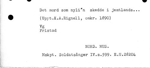 //// Det mord som nyli*n skedde i jemtlands... //// # (Uppt.K.A.Rignell, omkr. 1890) //// Vg //// Fristad //// NORD. MUS. //// Mskpt. Soldatsånger IV.s.599. E.U.28204 ////