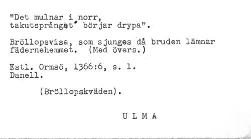 //// "Det mulnar i norr, //// takutsprång^t* börjar drypa". //// Bröllopsvisa, som sjunges då bruden lämnar //// fädernehemmet. (Med övers.) //// Estl. Ormsö, 1366:6, s. 1. //// Danell. //// (Bröllopskväden). //// U L M A ////