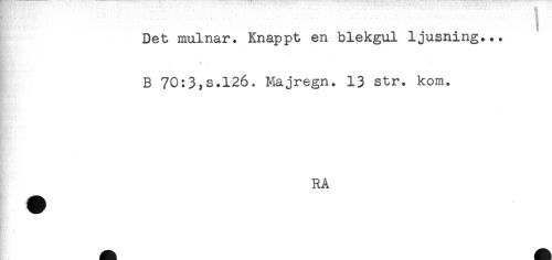 //// Det mulnar. Knappt en blekgul ljusning... //// * //// B 70:3,s.126. Majregn. 13 str. kom. //// RÅ ////