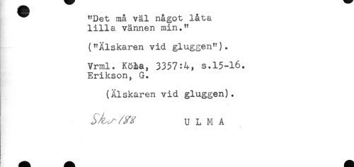 //// "Det må väl något låta //// lilla vännen min." //// ("Älskaren vid gluggen"). //// Vrml. Kö&a, 3357:4, s.15-16. //// Erikson, G. //// (Älskaren vid gluggen). //// U L M A ////