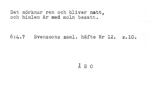 //// Det mörknar ren och bliver natt, //// och himlen är med moln besatt. //// 6:4*? Svenssons saml. häfte Nr 12. s.10. //// ÅBO ////