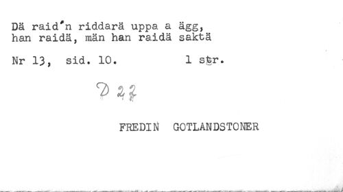 //// Dä raid*n riddarä uppa a ägg, //// han raidä, män han raidä saktä //// Nr 13, sid. 10. 1 str. //// FREDIN G0TLANDST0NER ////