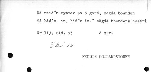 //// Dä räid*n ryttar pa ö gärd, sägdä bounden //// Så bid^n in, bid*n in.^ sägdä boundens hustrå //// * //// Nr 113, Sid. 95 8 str. //// # FREDIN GOTLANDSTONER ////