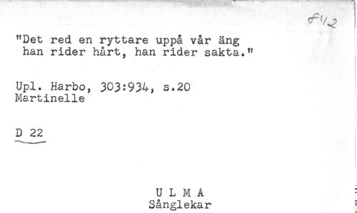 //// "Det red en ryttare uppå vår äng //// han rider hårt, han rider sakta." //// Upl. Harbo, 303:934, s.20 //// Martinelle //// D 22 //// ! //// } //// U L M A = //// < //// S^nplekar ^ ////