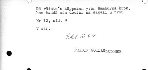 //// Dä räiste*n köppmann yvar Hamburgä bron, //// han haddä ain doutar så dägäli u trou //// Nr 12, sid. 9 //// 7 str. //// ^ FREDIN GOTLANDSTCNER ////