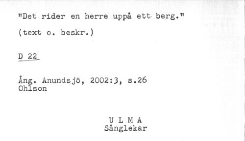 //// "Det rider en herre uppå ett berg." //// (text o. beskr.) //// D 22. //// Ang. Anundsjö, 2002:3, s.26 //// Ohlson //// f //// t //// < //// U L M A //// Sånglekar ////