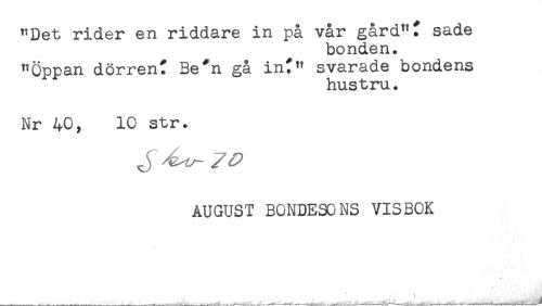 //// "Det rider en riddare in på vår gård"f sade //// bonden. //// "Öppan dörren^ Be*n gå inf" svarade bondens //// hustru. //// Nr 40, 10 str. //// AUGUST BONDESONS VISBOK //// ! //// _ _ _ ____ ____. _ ____ ____„_____- ---- -<--< „ t—"-'Mi- A «. ////