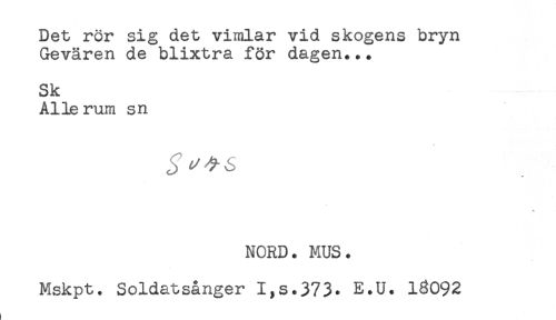 //// Det rör sig det vimlar vid skogens bryn //// Gevären de blixtra för dagen... //// Sk //// Alle rum sn //// s //// * //// NORD. MUS. //// Mskpt. Soldatsånger I,s.373. E.U. 18092 ////