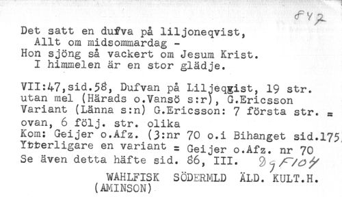 //// tfy^ //// Det satt en dufva på liljoneqvist, //// Allt om midsommardag - //// Hon sjöng så vackert om Jesum Krist. //// I himmelen är en stor glädje. //// VII:47,sid.53, Dufvan på Liljeqgist, 19 str. //// utan mel (Härads o.Vansö s:r), G.Ericsson //// Variant (Länna s:n) G.Ericsson: 7 första str. = //// ovan, 6 följ. str. olika //// Kom: Geijer o.Afz. (3:nr 70 o.i Bihanget sid.175 //// Ytterligare en variant = Geijer o.Afz. nr 70 //// Se även detta häfte sid. 86, III. //// WAHLFISK SÖDERMLD ÄLD. KULT.H. //// (AMINSON) ////