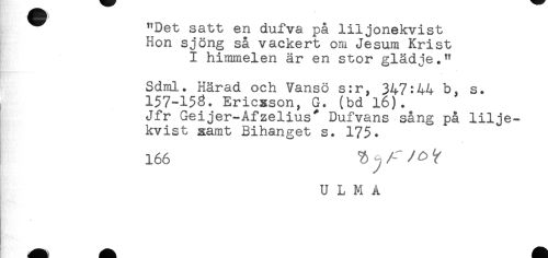 //// ^ "Det satt en dufva på liljonekvist //// Hon sjöng så vackert om Jesum Krist //// I himmelen är en stor glädje." //// Sdml. Härad och Vansö s:r, 347:44 b, s. //// 157-158. Ericsson, G. (bd 16). //// Jfr Geijer-Afzelius* Dufvans sång på lilje- //// kvist samt Bihanget s. 175. //// 166 //// U L M A ////