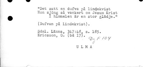 //// "Det satt en dufva på lindekvist //// Hon sjöng så vackert om Jesum Krist //// ^ I himmelen är en stor glädje." //// (Dufvan på Lindekvist). //// i //// Sdrnl. Länna, 347:48, s. I85. //// Ericsson, G. (bd 17 . //// q) //// U L M A //// - ////