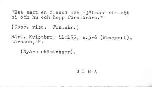 //// "Det satt en flicka och mjölkade ett nöt //// hi och hu och hopp faralarara." //// (Obsc. visa. Fon.skr.) //// Närk. Kvistbro, 41:155, s.5-6 (Fragment). //// Larsson, R. //// (Nyare skämtvésor). ////