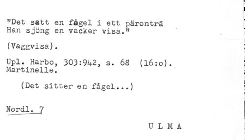 //// H //// "Det satt en fågel i ett päronträ ' //// Han sjöng en vacker visa." ' //// (Vaggvisa). ^ //// Upl. Harbo, 303:942, s. 6g (l6:o). ! //// Martinelle. ; //// (Det sitter en fågel...) ! //// f //// i //// Nordl._ 7 //// ' ! //// U L M Å ////
