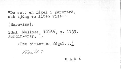 //// "De satt en fågel i päronträ, //// och sjöng en liten visa." //// (Barnvisa). //// *** i //// Sdml. Mellösa, 10166, s. 1139. //// Nordin-Grip, 1. //// (Det sitter en fågel...^ //// t //// f ////