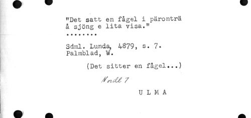 //// "Det satt en fågel i päronträ //// å sjöng e lita visa." //// ***** *** //// Sdml. Lunda, 4379, s. 7. //// Palmblad, W. //// (Det sitter en fågel...) //// ^^ //// /! //// }- ////